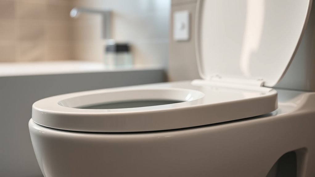 You might wonder if quiet-close lids fit all toilet models. While many are compatible, it depends on the toilet’s design and the seat’s attachment method. Consider toilet seat durability and lid material options to guarantee a good fit. Some models may require adapters or specific sizes. Checking your toilet’s shape, size, and mounting system helps you pick a quiet-close lid that’s compatible and durable, providing a smooth, silent close every time.