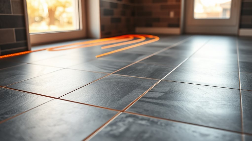 The installation process typically involves preparing the subfloor, laying insulation to prevent heat loss downward, and then installing the heating elements—either electric mats or pipes for hydronic systems—before covering them with your chosen flooring. It’s essential to guarantee proper spacing and secure placement to prevent damage and maximize efficiency. Connecting the system to a thermostat allows easy control over temperature, ensuring you can maintain a comfortable environment without wasting energy. Additionally, proper insulation can significantly improve the system’s efficiency by reducing heat loss through the floor. While some DIY enthusiasts may handle simple electric mats, professional installation is recommended for hydronic systems or complex setups to ensure safety and ideal performance.