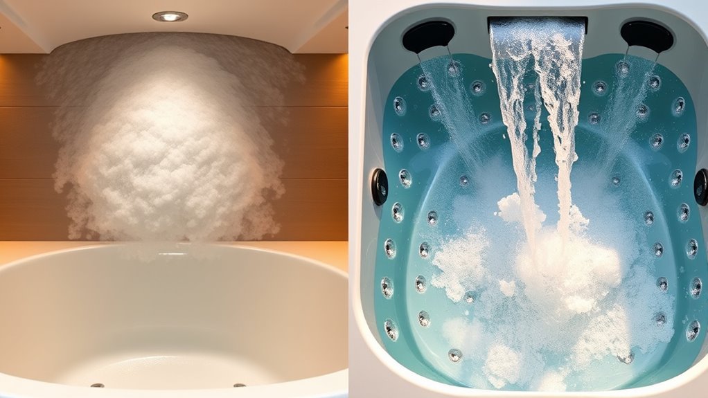 Air jet tubs produce gentle, bubbly streams that create a calming, sensory experience perfect for relaxation and aromatherapy. In contrast, water jet tubs deliver powerful jets that provide targeted massage and deep tissue therapy, ideal for muscle relief. Air jets tend to be quieter and more energy-efficient, while water jets focus on hydrotherapy benefits. To discover which option best suits your needs and preferences, explore more about their features and benefits.