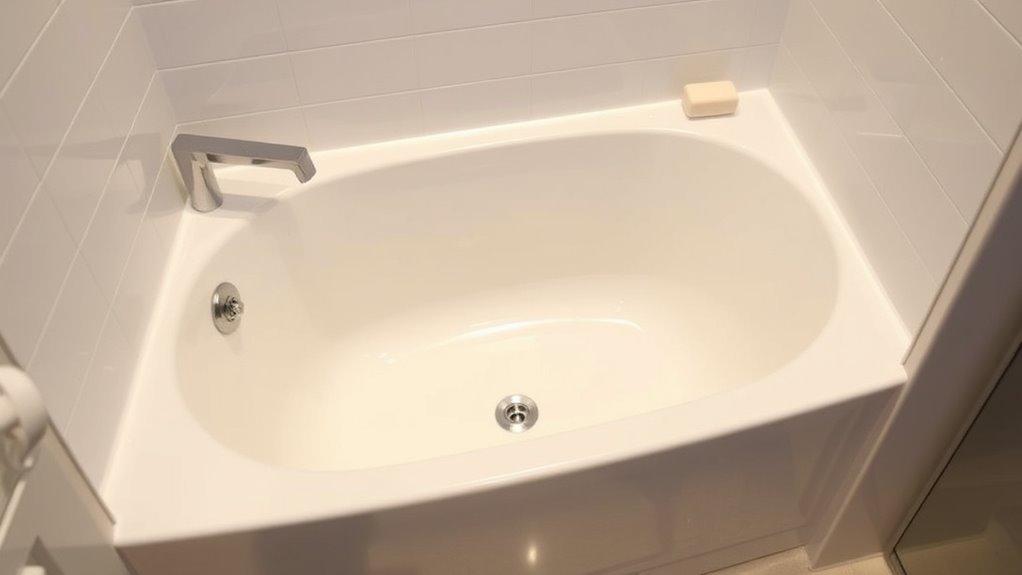 Think of your small bathtub as a delicate garden—needs gentle care to stay beautiful. To maintain it, regularly perform bathtub cleaning to prevent soap scum and grime buildup. Use water wisely by avoiding excessive water usage during cleaning, conserving resources. Rinse thoroughly and wipe dry to prevent mold. A little daily attention keeps your compact tub sparkling and inviting, making each bath a invigorating retreat amid your busy life.