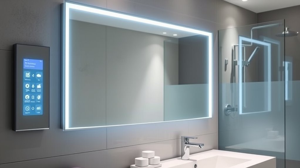 You should look for bathroom tech with smart sensors that automatically turn off or adjust when not in use, preventing accidents. Anti-fog technology is essential for mirrors, ensuring clear visibility even in humid conditions. Prioritize devices with waterproof ratings and slip-resistant features around tech installations. These safety features help protect you and keep your bathroom safe, functional, and convenient, giving you peace of mind during daily routines.