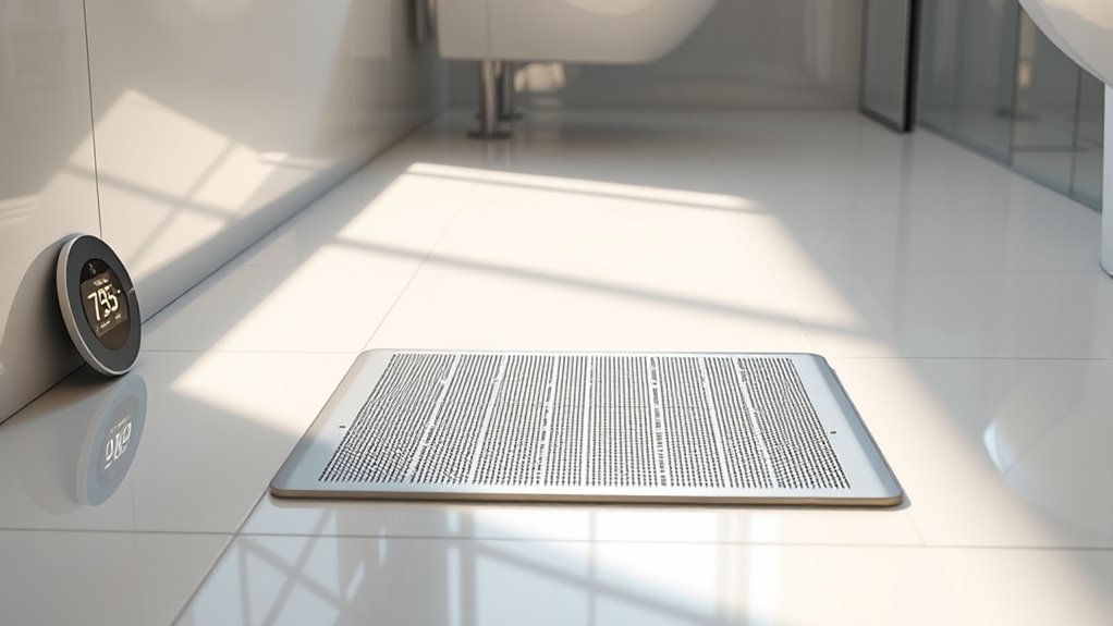 In a world where sustainability is key, you’ll find eco-friendly and energy-efficient underfloor heating options. Look for systems powered by renewable energy sources and made from low emission materials, which reduce your carbon footprint. Modern electric or hydronic systems often incorporate smart controls, ensuring efficient use of energy. You can enjoy warm floors while supporting environmental health, making your bathroom both cozy and eco-conscious—truly a win-win for the future.