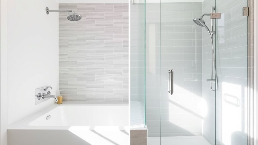 Converting a bathtub into a walk-in shower can be a practical upgrade that enhances accessibility and modernizes your bathroom. This transformation not only improves functionality but also boosts your bathroom’s aesthetics, giving it a sleek, contemporary look. When planning this change, you’ll need to contemplate necessary plumbing upgrades to ensure the new shower functions properly and complies with local codes. The goal is to create a space that feels open and inviting, so pay attention to design details like tile choices, shower doors, and fixtures to achieve a cohesive, stylish appearance.