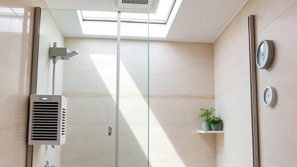Steam showers create a relaxing experience, but the high humidity can also lead to mold and mildew if you’re not careful. To keep your steam shower healthy and safe, proper ventilation practices are vital. After each use, make sure to turn on the exhaust fan or open a window if possible. This helps remove excess moisture from the air, preventing it from settling on surfaces and creating an ideal environment for mold growth. If your bathroom lacks adequate ventilation, consider installing a high-quality exhaust fan or an additional vent to improve air circulation. Running the fan for at least 15-20 minutes after each session ensures that humidity levels drop quickly, reducing the risk of mold spores taking hold. HEPA filters in ventilation systems can also help trap airborne mold spores, further protecting your space. Consistent ventilation not only keeps your steam shower dry but also improves air quality throughout your bathroom.