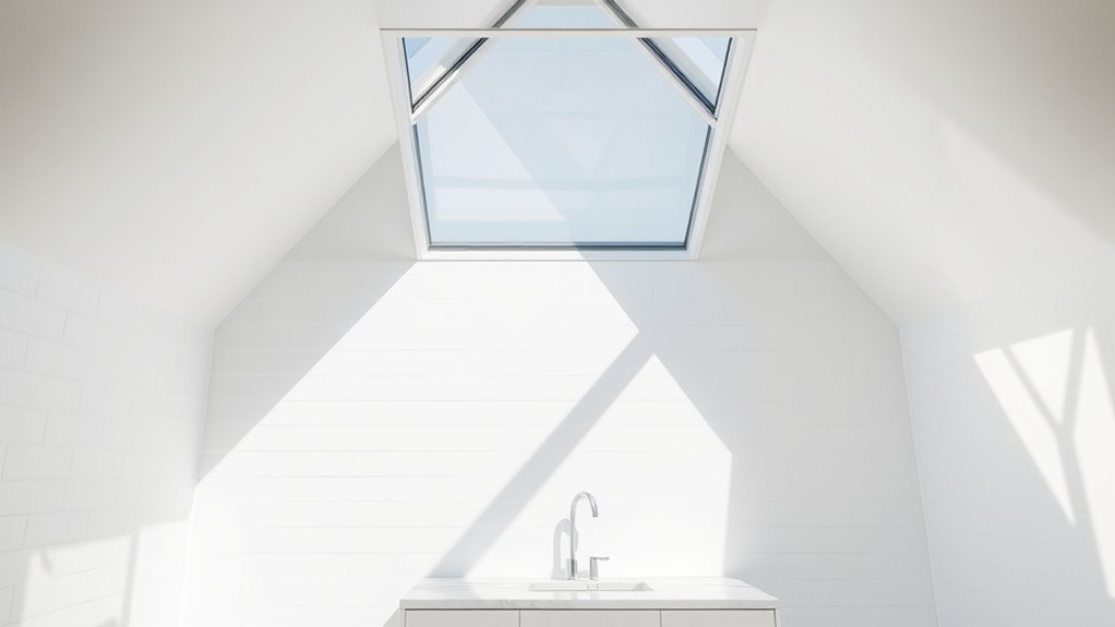 When it comes to installation, you’ll want to guarantee the skylight is properly sealed to prevent leaks, especially since bathrooms are exposed to high humidity. A professional installation assures that the skylight is fitted correctly and that flashing is properly integrated into your roof. This step is vital for durability and to avoid water damage. Additionally, choosing a skylight with energy-efficient glazing can help regulate temperature, keeping your bathroom comfortable year-round without adding to your energy bills.