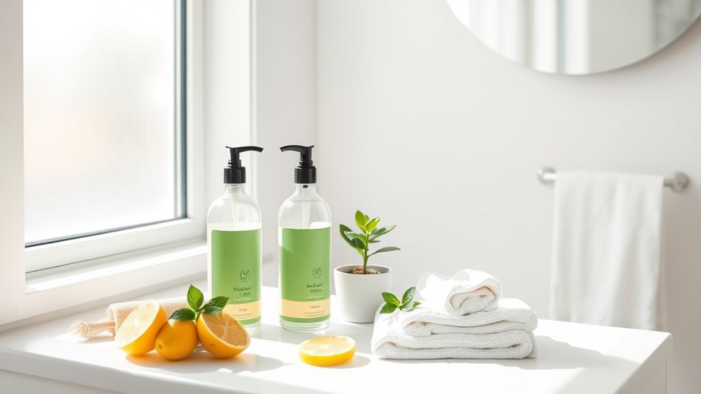 To start eco-friendly bathroom cleaning, use natural disinfectants like vinegar and baking soda, and switch to biodegradable brushes made from bamboo or plant fibers. Avoid aerosol sprays and single-use wipes, opting instead for reusable cloths and spray bottles. Incorporate these tips into your routine to reduce waste, avoid harmful chemicals, and protect the environment. Keep exploring to discover more green products and clever strategies for a sustainable, spotless bathroom.