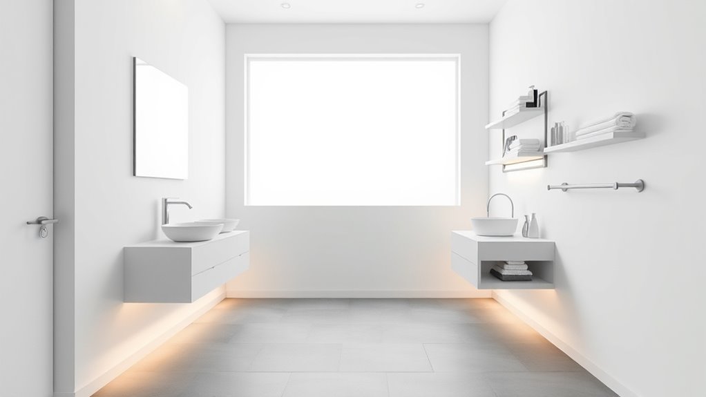 To keep your minimalist bathroom clutter-free, focus on storage and simplicity. Use sleek, hidden storage options to hide toiletries and avoid excess decorative accessories. Limit wall art to a single, impactful piece that adds personality without overwhelming the space. Regularly declutter, keeping only essentials visible. This approach maintains a clean, organized look while allowing subtle decorative touches to enhance your minimalist aesthetic.