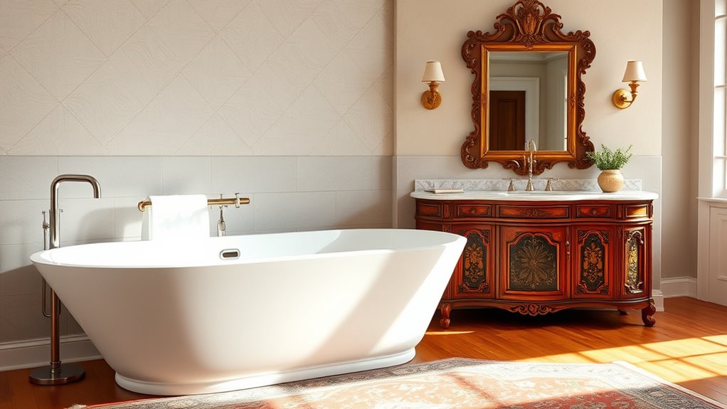 Finally, pay attention to color schemes and materials. Neutral tones like whites, creams, and soft grays serve as a perfect backdrop, allowing vintage fixtures and art deco accents to stand out. Use modern materials such as glass, polished metals, or sleek ceramics to complement the vintage elements, creating a cohesive look that is both lively and balanced. When you carefully select and blend these features, your bathroom becomes a timeless retreat—an elegant space that respects tradition while embracing modernity. This thoughtful mix ensures your bathroom remains stylish and relevant, no matter how trends evolve.