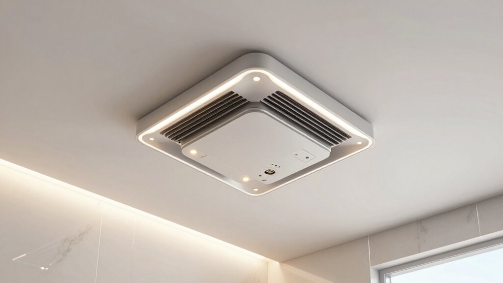 When considering a bathroom exhaust fan with light and heater, it’s important to pay attention to the lighting options it offers, as they can greatly enhance your overall experience. Many models feature LED lighting with adjustable color temperatures from 2700K to 6000K, letting you customize the light for different moods or tasks. Some units include dimmable LEDs that you can control remotely or via wall switches, providing flexible brightness levels. Brightness varies from 1500 to 6000 lumens, ensuring ample light for grooming or makeup. Additionally, certain fans offer RGB or multi-color lighting, allowing you to change colors for ambiance. Energy-efficient LEDs consume less power—often under 30W—while delivering bright, consistent illumination suitable for daily bathroom activities.