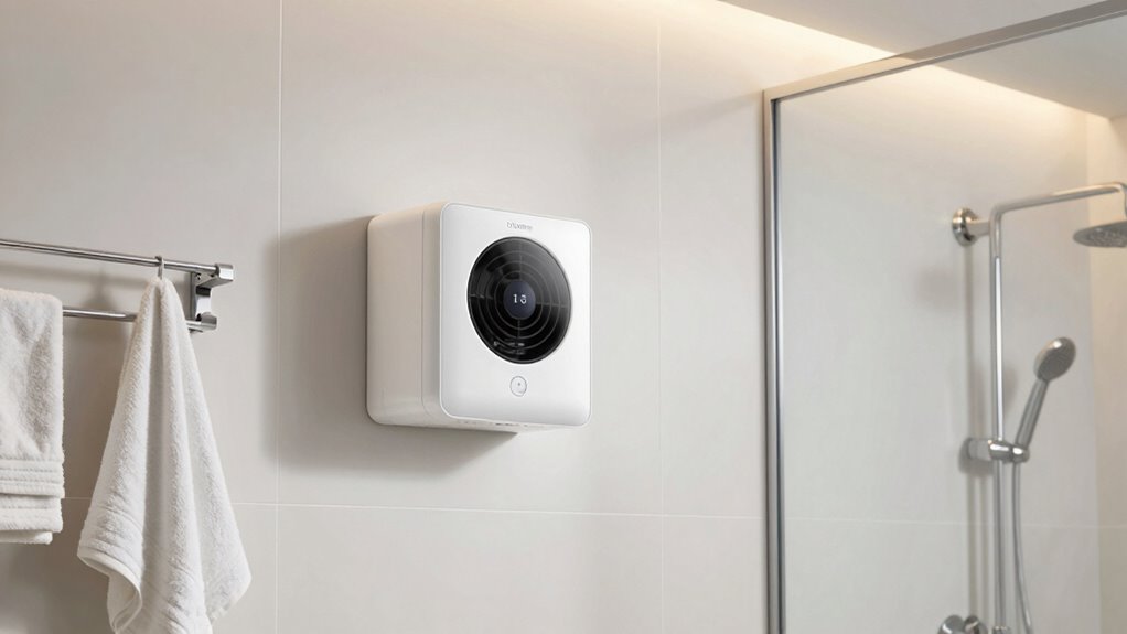 Have you considered the extra features that can elevate your bathroom experience beyond basic heating and ventilation? Features like LED lighting, Bluetooth speakers, and remote controls add convenience and ambiance, making your bathroom more enjoyable. Some models offer multiple color temperature options, allowing you to customize ambient lighting for better visibility or mood setting. Integrated air purification technologies, such as negative ion generators, can improve indoor air quality while you heat and ventilate. Additional features like condensation sensors and timers help optimize energy use and prevent overheating. Compatibility with smart home systems or customizable controls also lets you personalize your bathroom environment, making it more comfortable and efficient. These extras can profoundly enhance your overall experience and make your bathroom feel more modern and functional.