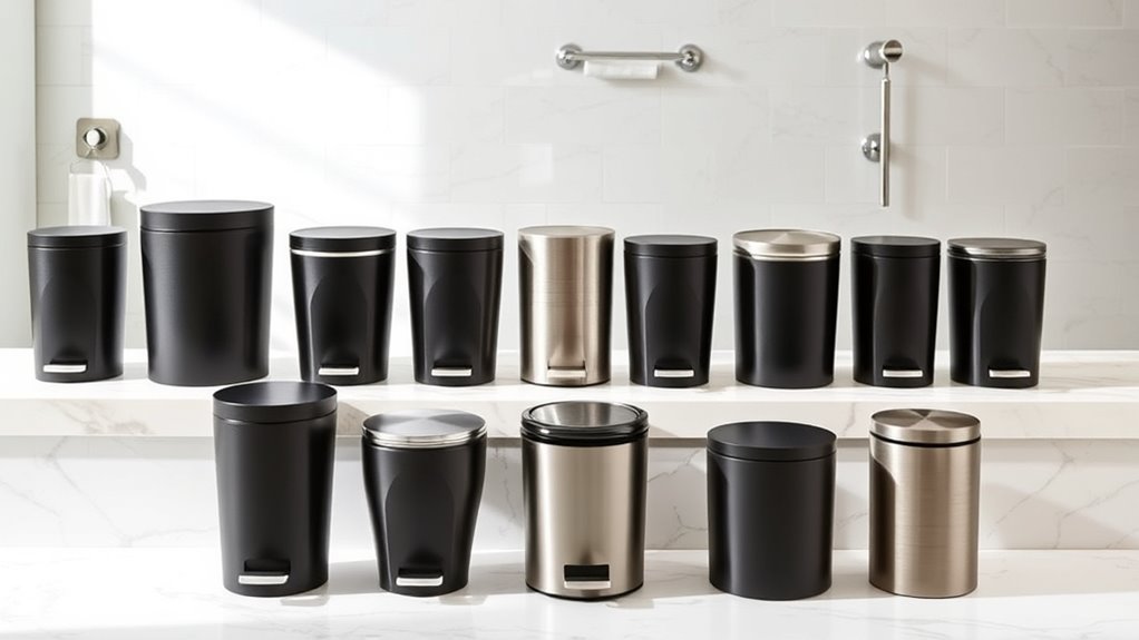 If you’re searching for stylish, space-saving bathroom trash cans that keep your space tidy, I’ve got some great options for you. From sleek touchless designs like the 2.7-gallon cans to compact models with soft-close lids and removable Buckets, there’s something for every small bathroom. Materials like stainless steel and impact-resistant plastics guarantee durability, while odor control features help keep things fresh. Keep exploring to find the perfect fit for your bathroom needs.