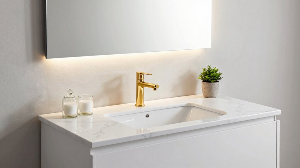 I recommend choosing bathroom vanity sets made from solid wood or high-quality MDF with a moisture-resistant finish. Solid wood offers exceptional durability and a classic look, while MDF with a waterproof coating resists warping and moisture damage. Avoid cheaper particleboard or untreated materials, as they tend to deteriorate quickly in humid environments. Investing in these durable materials guarantees your vanity stays beautiful and functional for years to come.