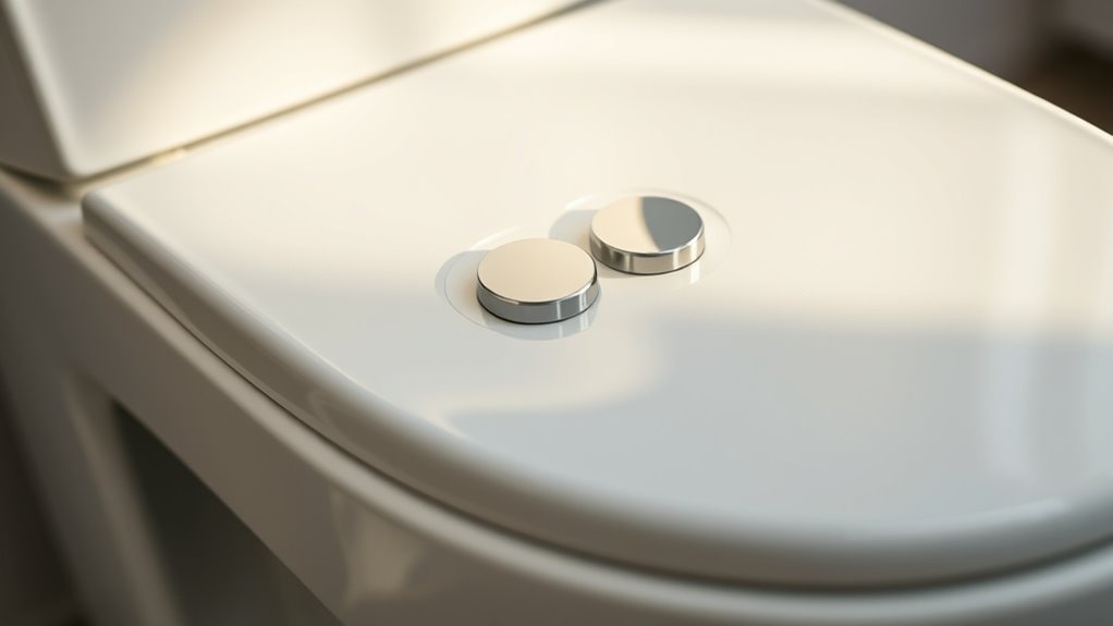 When selecting a dual-flush retrofit kit, paying attention to material durability and quality can make all the difference in its long-term performance. High-quality kits use durable materials like ABS plastic, silicone, or rubber, which resist wear and chemical damage over time. Corrosion-resistant components prevent rust and deterioration, ensuring the system stays reliable. Silicone seals and gaskets provide a leak-proof connection, minimizing water wastage and reducing repairs. Materials certified by FDA or WaterSense guarantee safety, non-toxicity, and environmental friendliness. Additionally, a well-made kit features reinforced joints and sturdy fittings that withstand daily use without compromising performance. Prioritizing these durable materials and high-quality construction guarantees your retrofit remains effective, leak-free, and long-lasting, making your investment worthwhile.
