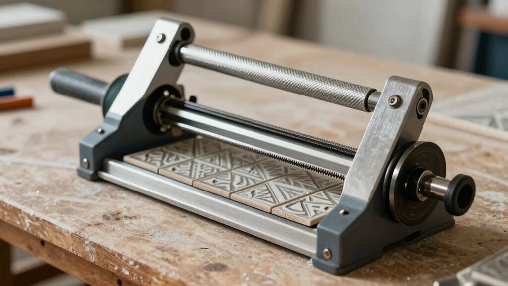 Portability and storage are key factors to take into account when selecting a heavy-duty manual tile cutter, especially if you need to move it frequently across different job sites. A lightweight design made from durable aluminum or alloy materials makes transportation easier. Foldable or retractable components, like handles or support arms, help save space and make carrying more manageable. Built-in wheels or casters with silent rubber tires allow smooth, surface-friendly movement around work areas. A foldable ruler or adjustable base enhances quick setup and compact storage, which is especially useful in limited spaces. Compact dimensions and a sturdy carrying handle are essential for convenience. Overall, prioritizing these features guarantees your tile cutter is easy to transport and store, saving time and effort on every project.