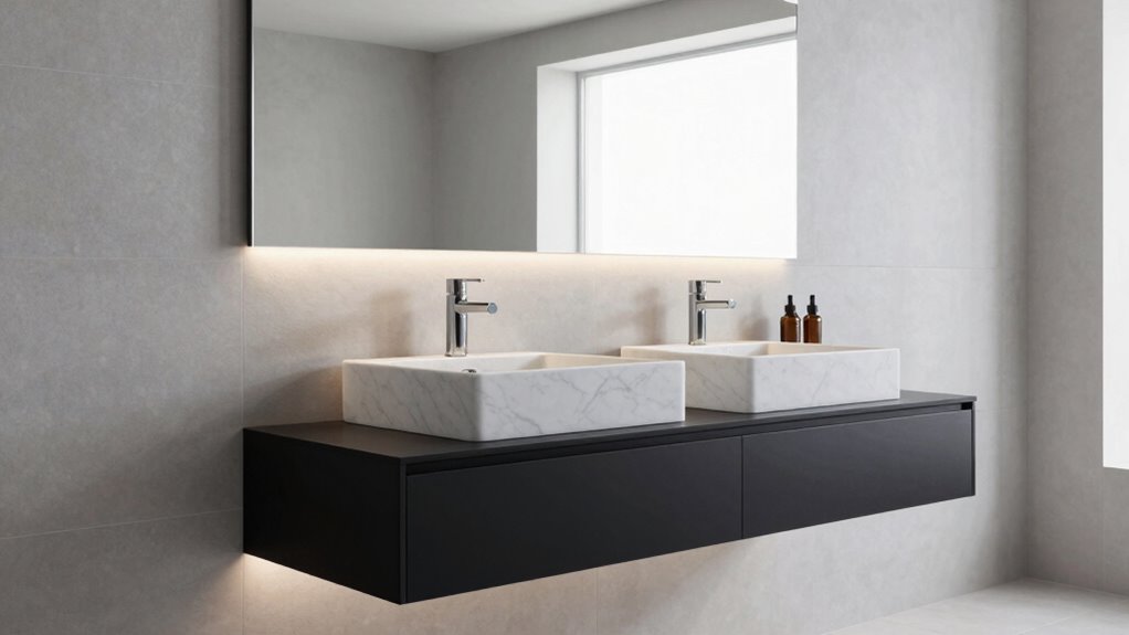 Choosing the right materials for a floating bathroom vanity is vital because durability directly affects its longevity and appearance. I look for materials like solid wood, moisture-resistant MDF, or stone resin, which stand up well to daily use. Impact and scratch resistance are essential, so I prefer surfaces like ceramic, SMC, or sintered stone to keep the vanity looking new over time, even in humid environments. Waterproof, fade-resistant finishes prevent warping, staining, or deterioration from moisture and cleaning agents. The structural integrity relies on high-quality, engineered construction that resists sagging or cracking. Additionally, proper sealing and multi-layer surface treatments boost water resistance and make cleaning easier. These factors ensure my vanity remains functional and attractive for years to come.