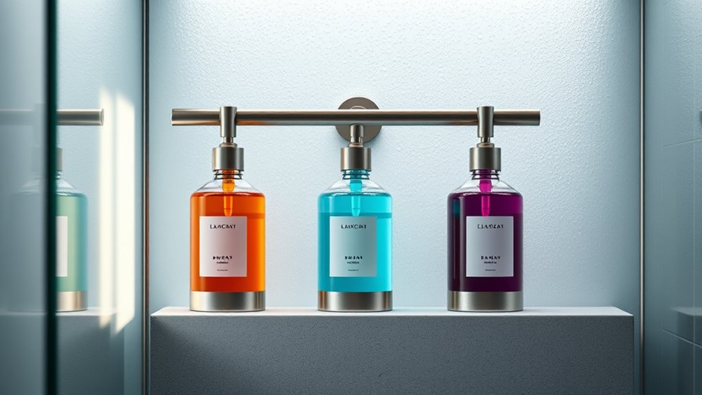 Choosing the right shower dispenser can truly elevate your morning routine, making it feel more like a spa day than a chore. With so many great options, you’ll find one that fits your style and needs—be it sleek, multi-chamber, or wall-mounted. Remember, it’s like having your own personal apothecary; once you find the perfect fit, you’ll wonder how you ever showered without it. Trust me, your mornings will thank you—no need for a time machine to enjoy modern luxury!