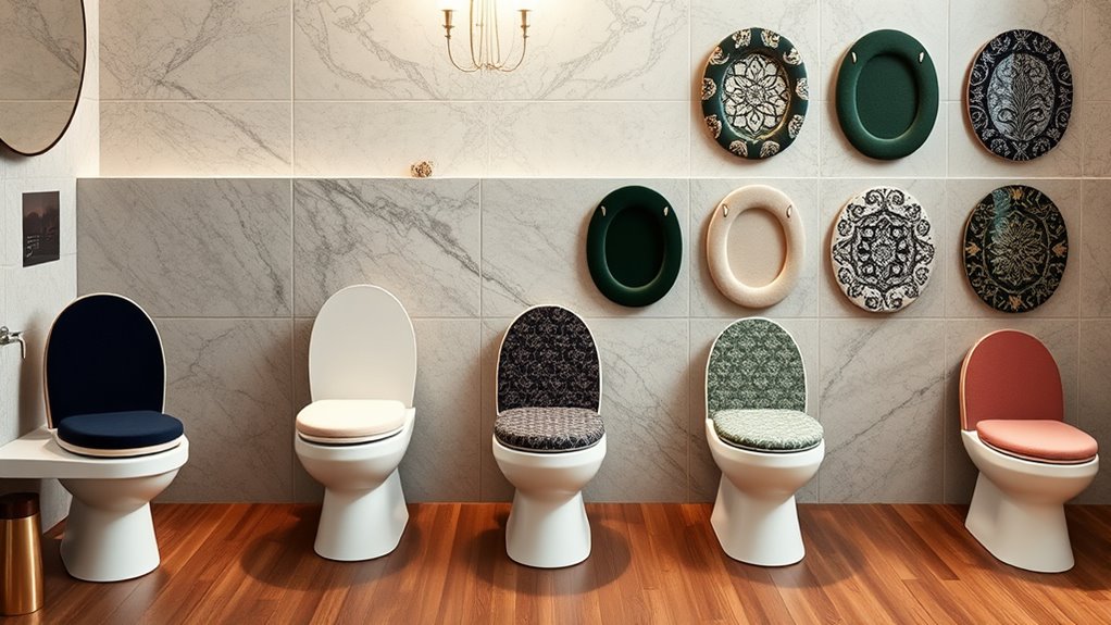 While exploring toilet seat covers, I quickly realized that the material composition plays a essential role in my overall satisfaction. I found options like biodegradable paper, which is eco-friendly and breaks down easily in septic systems, making it a great choice for the environment. Then there are plastic polymers, providing waterproof protection and potential flushability, though their biodegradability can vary. For added comfort, I considered fabric covers like microfiber or chenille, which are reusable and washable, but they do require regular cleaning. Ultimately, the material affects tear resistance, moisture resistance, and softness, so I made sure to weigh these factors carefully when choosing a toilet seat cover that suits my needs and values.