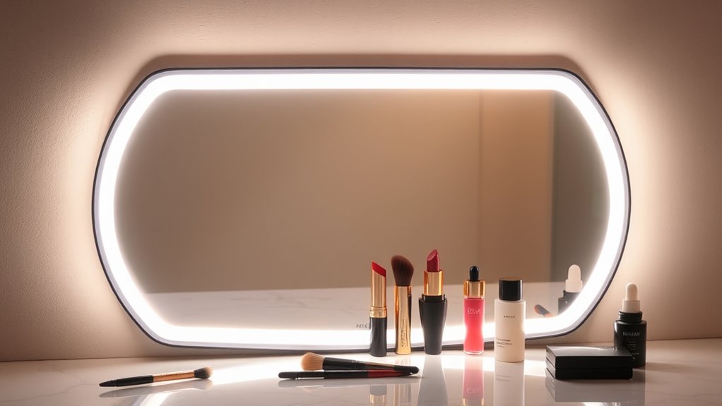 Choosing the right brightness level on a vanity mirror with lights is essential for creating an ideal grooming environment. Adjustable brightness allows me to customize lighting intensity, making detailed makeup and grooming tasks easier. Most mirrors offer multiple settings, from soft ambient light to bright task lighting, so I can select what’s best for different needs and environments. I prefer mirrors with touch sensors, dimmer switches, or long-press controls, which give me precise adjustments. High-quality mirrors with stepless dimming provide seamless brightness changeovers, ensuring best lighting at all times. Proper brightness levels help prevent eye strain and reduce shadows, giving me a clear, natural reflection. This customization makes my beauty routine more comfortable, efficient, and enjoyable.