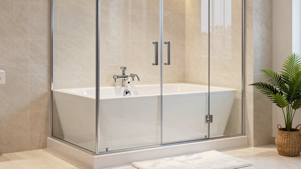 Selecting a walk-in bathtub that truly meets a senior’s needs involves carefully considering key accessibility design elements. These include low thresholds, wide doors, and enough interior space to accommodate mobility aids and reduce fall risks. Built-in grab bars, non-slip flooring, and ergonomic seating are essential for safety and ease of use. Doors that swing outward or inward with secure latches make entry and exit safer, especially for those with limited strength. The step-in height should be around 4 inches or less to minimize strain and support independent access. Additionally, clear, simple controls and easy-to-reach features help users with varying dexterity levels operate the tub comfortably. Paying attention to these elements guarantees the bathtub is both safe and accessible.