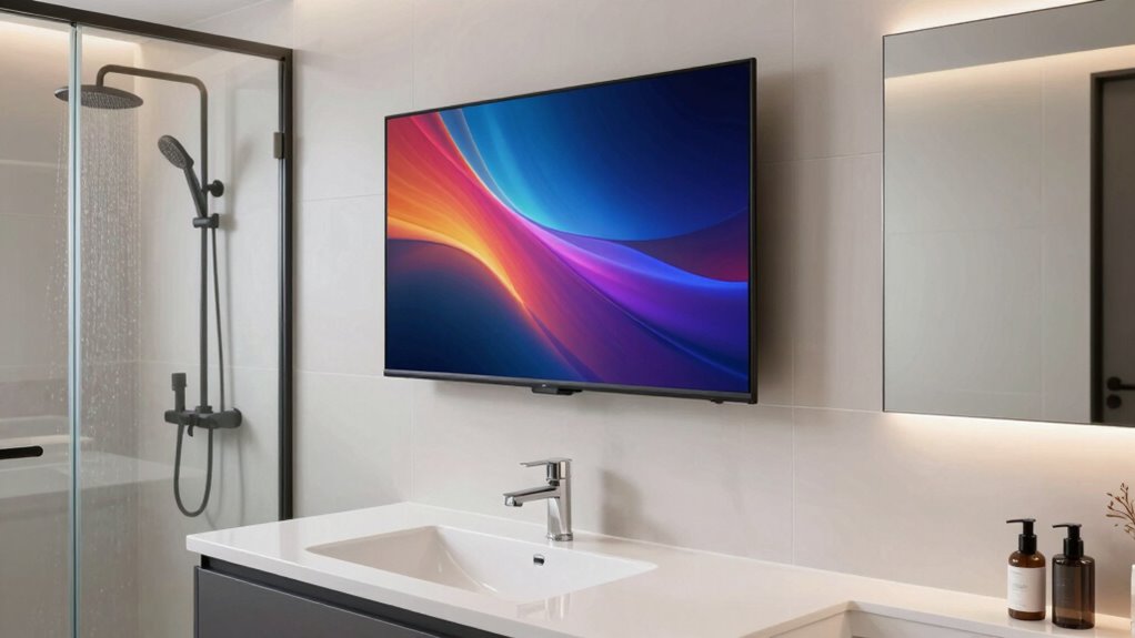 Considering how important connectivity options are, guaranteeing the power supply is safe becomes just as essential when selecting a waterproof smart TV for your bathroom. These TVs typically run on low-voltage DC power, like 12V or 24V, to reduce electrical risks in humid environments. An IP66 waterproof rating indicates the device can withstand powerful water jets, further protecting against water ingress. Using a dedicated, certified waterproof power supply is critical to prevent shocks and water damage. Proper installation, including waterproof connectors and sealed wiring, is necessary to maintain safety in damp spaces. Also, look for safety certifications such as UL or CE approval, which demonstrate the TV’s power system meets strict safety standards. Prioritizing power supply safety ensures worry-free use in your bathroom.