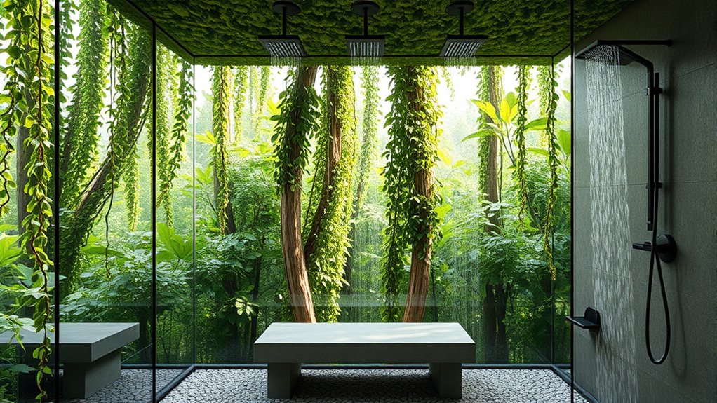 To bring nature into your shower, incorporate natural materials like river stones, bamboo accents, and teak wood for a warm, organic feel. Add water features such as rainfall showerheads or wall-mounted waterfalls to create a soothing, immersive experience. Combining textures, flowing water, and natural aesthetics turns your shower into a tranquil retreat that promotes relaxation and well-being. Keep exploring to discover how these elements can transform your daily routine into a calming sanctuary.