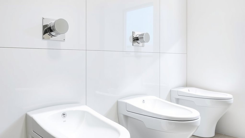 Public restrooms rely on well-designed toilets to guarantee hygiene, comfort, and efficient use of space. When it comes to choosing the right fixtures, innovations from brands like Sloan and other commercial toilet manufacturers play a critical role. These companies are continuously advancing their products to meet the evolving needs of public spaces, emphasizing sustainability and accessibility. Eco-friendly designs are at the forefront, helping you reduce water consumption and minimize environmental impact. Low-flow toilets, for instance, use considerably less water per flush while maintaining excellent performance, making them ideal for high-traffic areas. Many models incorporate dual-flush options, giving users control over water use depending on their needs, which further conserves resources. These sustainable features not only benefit the environment but can also lead to cost savings for facility managers over time. Additionally, innovations in toilet design focus on integrating smart technology to improve user experience and maintenance efficiency. Accessibility improvements are equally essential in modern public restrooms, ensuring everyone can use the facilities comfortably and independently. Brands like Sloan have developed toilets with features such as higher seating heights, easier-to-operate flushing mechanisms, and integrated support bars. These enhancements help accommodate users with mobility challenges or disabilities, aligning with ADA requirements and promoting inclusivity. You’ll find that these accessible toilets often include touchless flush systems, which prevent the spread of germs—a vital factor in maintaining hygiene in busy public spaces. The integration of automatic lids and flushes reduces the need for physical contact, making the experience safer and more sanitary for all users. Sloan’s innovations in commercial toilets also extend to the design and engineering of the flushing systems. You benefit from quiet, efficient operation that minimizes disturbance in busy environments like airports, malls, or stadiums. Smart flushing technology adjusts water use based on the type of waste, ensuring ideal performance without excess water use. Furthermore, these systems are built for durability, reducing maintenance costs and downtime, which is essential for high-use facilities. Their sleek, modern designs blend seamlessly into various architectural styles, ensuring the restrooms look clean and inviting.