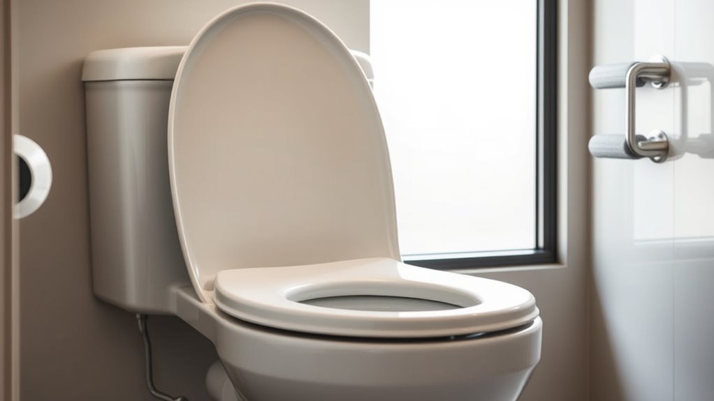 Comfort height toilets are designed to improve ergonomics and accessibility in your bathroom. With a seat height of about 17 to 19 inches, they make sitting down and standing up easier, especially if you have mobility issues or joint pain. Their higher seat reduces strain on your hips and knees and often includes features that help meet ADA standards. If you’re interested, you’ll discover how these toilets enhance safety and comfort for all users.