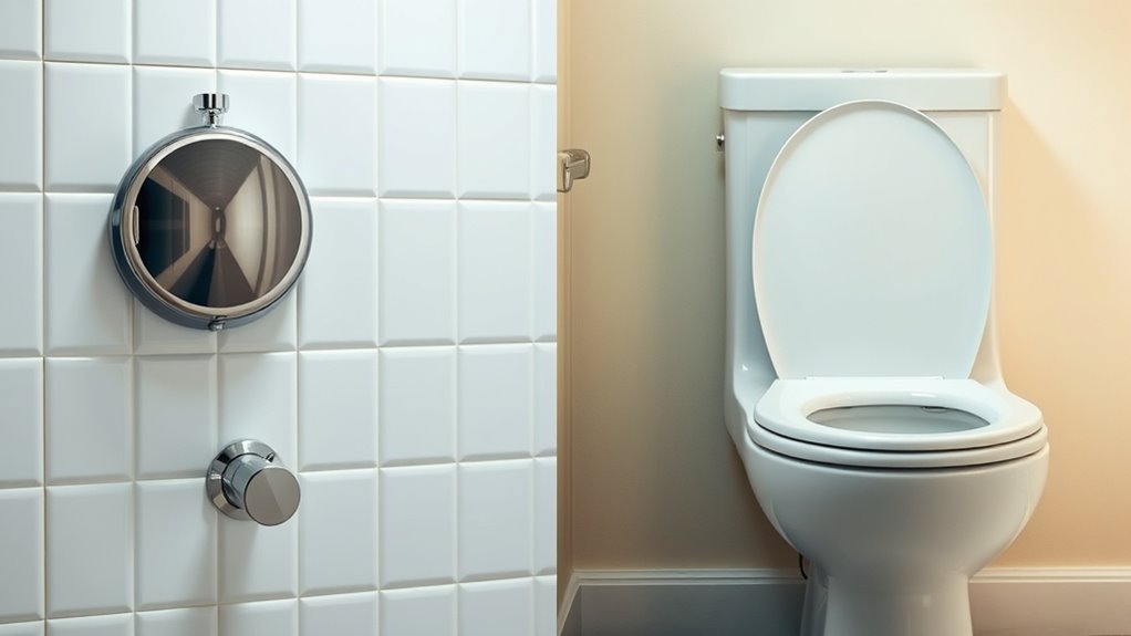 You’ll notice water conservation features differ considerably between the two systems. Flushometers often have advanced water efficiency options, like dual-flush or sensor-activated models, which reduce water use and improve leak prevention. Tank toilets generally use more water per flush but can include low-flow models. Your choice impacts leak prevention and overall water conservation, making it essential to weigh your specific needs for efficiency and sustainability.